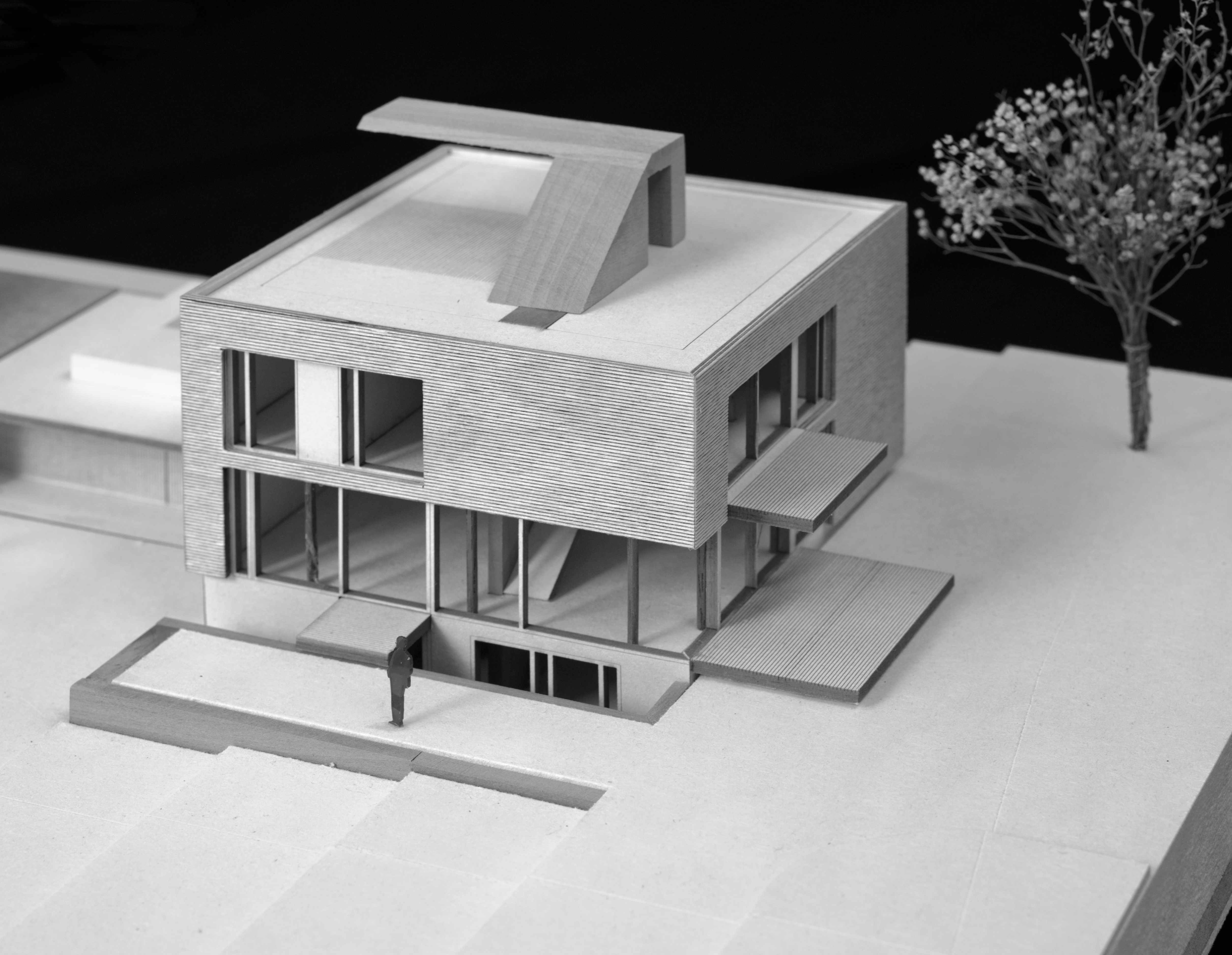 Der bestehenden Geländemodulation folgend ergibt sich eine halbgeschossige Differenz von Eingangs- zu Wohnebene. Über eine Split-Treppe gelangt man in das UG mit Nebenräumen bzw. nach oben auf einen offenen Bereich für Kochen, Essen, Wohnen mit direkter Anbindung an den Garten.